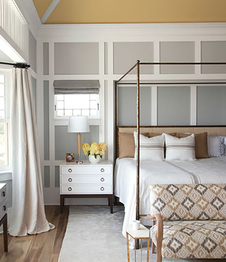 When it comes to paint decorating, the ceiling is often overlooked. While classic white is a perennial favorite, an unexpected color on the ceiling enhances the room's character. Given that this is your own personal space, consider getting a bit more creative with color on your bedroom ceiling, as seen here in Concord Ivory HC-12.