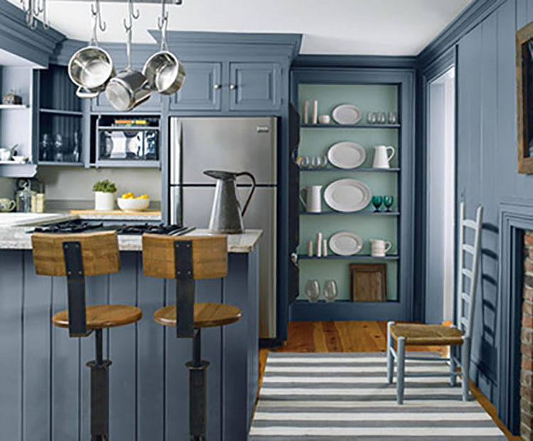 Kitchens have several fixed elements, including the countertop, backsplash, cabinets and flooring. While neutrals are very popular for kitchens, there are also opportunities to bring accent colors into the room—even a small dose of color makes a big impact. Benjamin Moore’s Regal® Select Interior paints offer fresh color for your kitchen along with superior durability and washability no matter what sheen you choose.Cabinets take up the most visual space, so let them guide you to the best colors for your kitchen. If your cabinets are finished in dark or medium wood, look to colors that will create balance by using lighter hues. White and pale wood cabinets pair well with many colors, particularly cool blues, grays and greens for a look that is updated and works for both modern and traditional schemes.
